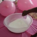 Blow a latex balloon into the shape of a large egg. In a bowl, mix equal parts water and glue. |